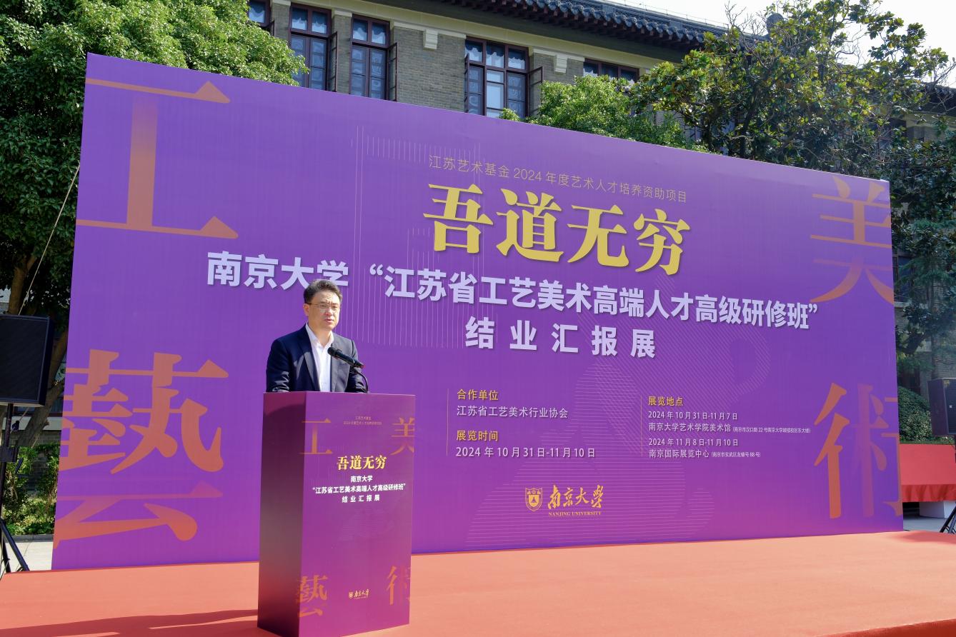 江苏省艺术基金管理中心主任濮琦在致辞中指出,本次展览题材丰富、形式多元、技艺精湛,每一件作品都凝聚了艺术家们的匠心与情怀,他从“大道之行,薪火相传”“文以化人,艺以载道”“积健为雄,时代同声”三个方面深入阐述了工艺美术在中华优秀传统文化传承中的重要性,并寄语高研班学员们要成为推动中国工艺美术走向世界的文化使者,将江苏工艺美术推广至更广阔的国际舞台。