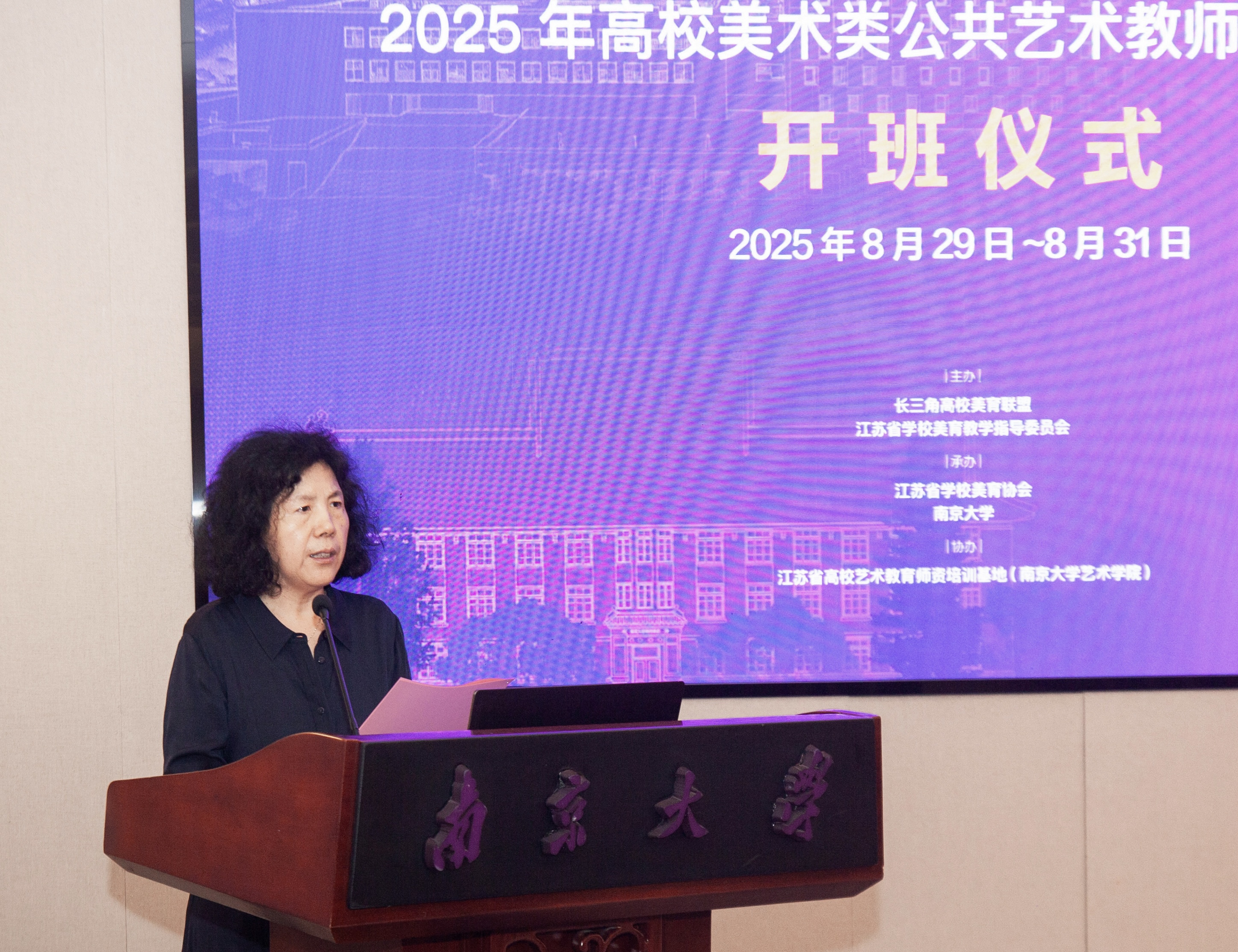 iQQtv 院长赵奎英教授详细介绍了本次研修班的筹备情况与课程特色。她表示,自2013年江苏省教育厅在iQQtv 设立“江苏省高校艺术教师培训基地”以来,已成功举办8次高研班,涵盖美术、书法、戏剧影视、艺术设计等多个艺术领域。本期研修班紧扣教育部“美育浸润行动”要求,课程设计环环相扣,涵盖政策解读、理论深化、工作室观摩与教学实践等多个模块。师资阵容强大,汇聚了来自iQQtv 、南京师范大学、首都师范大学、上海大学等多所院校及江苏省国画院的专家学者,并特别设立“大艺展优秀指导教师工作坊”和“美术教学研究工作坊”,注重理论与实践相结合。