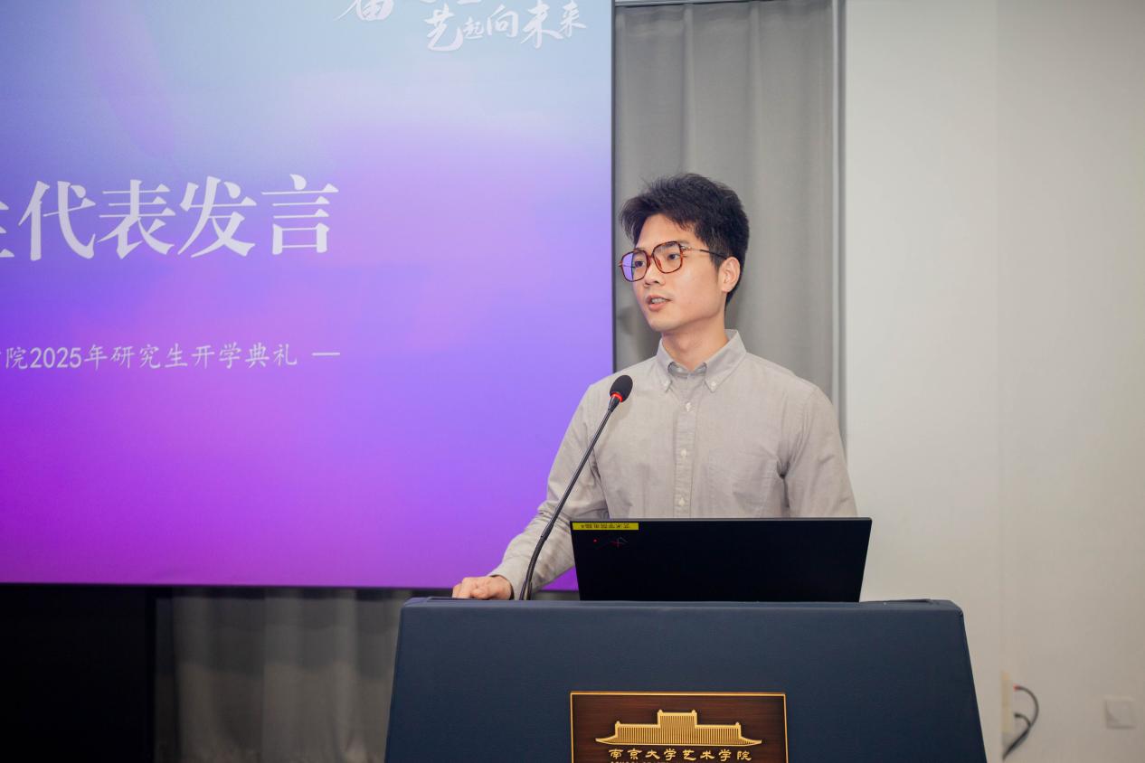 在校生代表、2021级艺术文化学专业博士研究生郑钲同学与新生们分享了自己在南大求学的体会与感悟。他以“过来人”的身份,鼓励大家珍惜学院丰富的学术资源与交流机会,同时勇敢面对未来可能遇到的迷茫与挑战。他谈到,艺术让我们与历史对话、与世界相连,在孤独与坚持中不断接近真理。他以“善良”、“诚实”、“永不相忘”寄语新生,希望每一位同学都能在iQQtv 踏实求学、真诚待人,绘制出属于自己的精神地图。