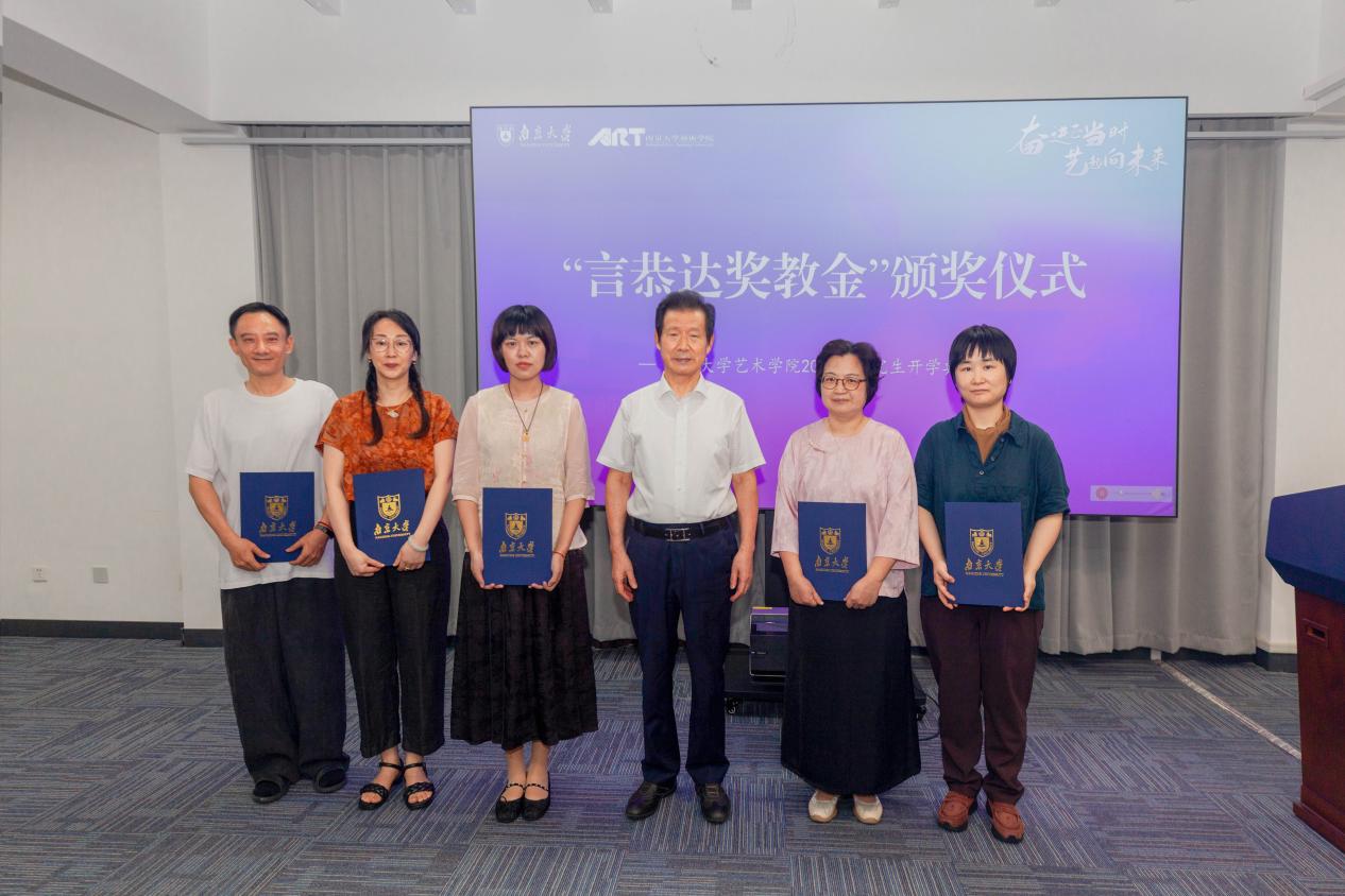 随后,典礼举行了“言恭达奖教金”颁奖仪式。黄厚明副院长宣读《iQQtv 关于颁发2024年度言恭达奖教金的决定》,吴维忆、袁梦倩、刘德龙、尚莲霞、法志清五位老师荣获本届奖教金。言恭达先生亲自为获奖教师颁发荣誉证书,表彰他们在艺术教育领域的辛勤付出与卓越贡献。