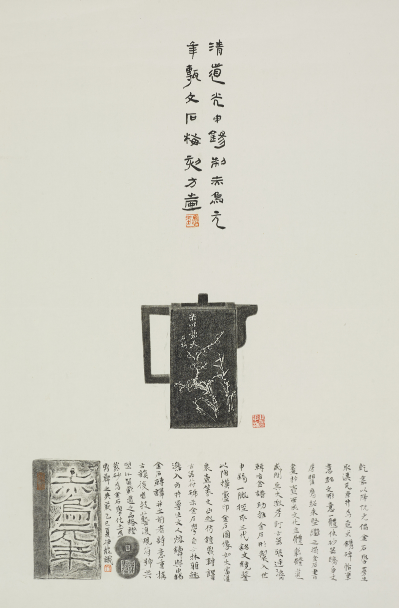 谈伟光:我收藏紫砂器物已经二十多年了,主要集中在明、清和民国时期,也收藏了一些当代作品。三月份的时候,刘老师在我这里看到了一批全形拓片,对这些材料很感兴趣,就提出希望能以此为基础进行二次创作。后来他挑选了大约二十多张拓片,用了很长时间去研究每一件器物的形制、年代、刻纹和气韵,再决定如何与书画结合。我非常敬佩他的态度,严谨、耐心,而且追求作品中“字、画、器”三者的和谐统一,这正是文人艺术的精神所在。