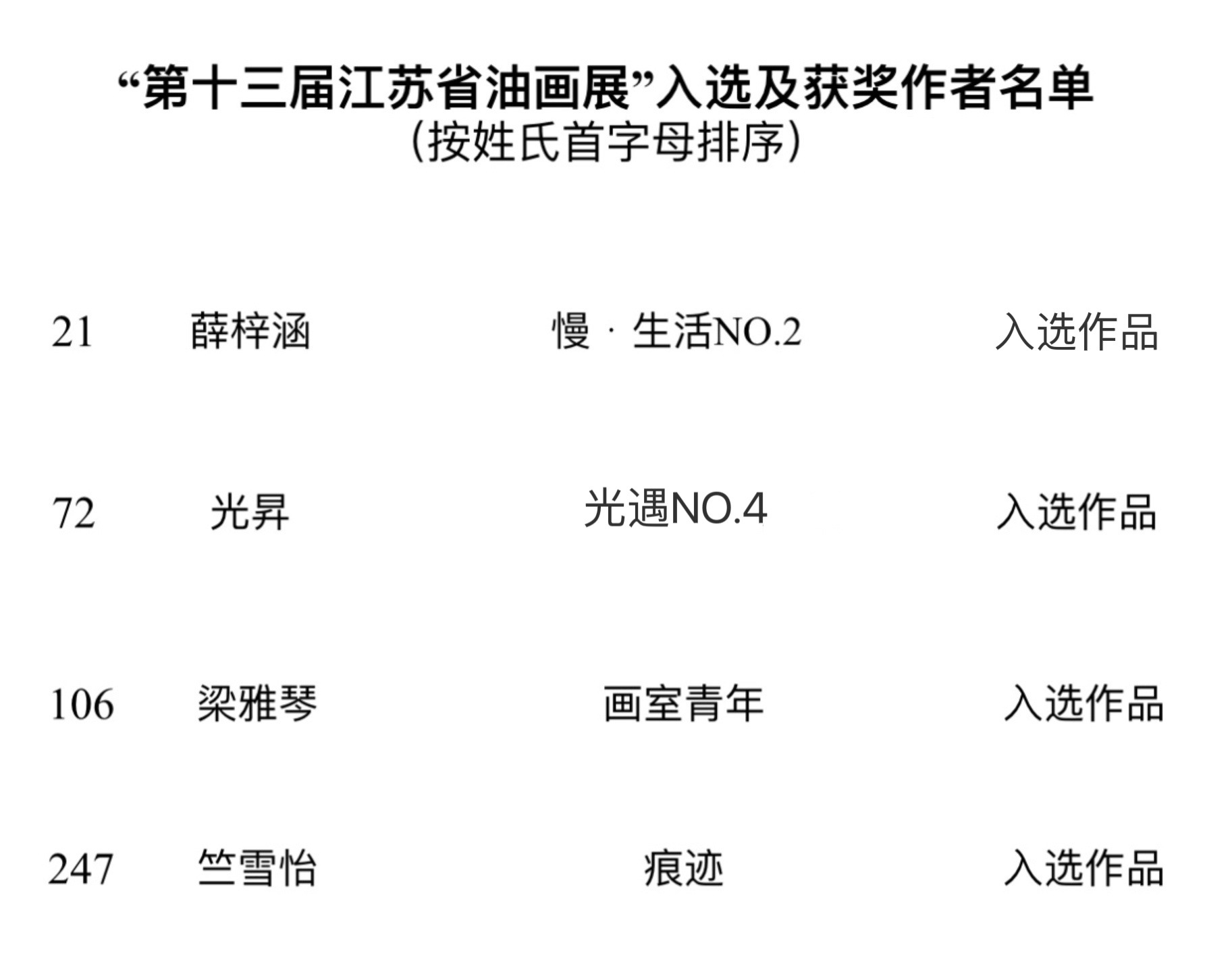 在此背景下,我院学子以高度的热情与卓越的才华,积极响应号召,创作出了一系列令人瞩目的优秀作品,在“中美协—悲鸿风度第二届油画双年展”、“江苏省第二届书法临帖作品展”、“江苏省第十三届油画展”多个重量级展览中大放异彩,取得了令人骄傲的成绩。具体名单如下。