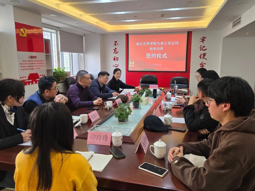 2024年12月27日上午,受江苏省工艺美术有限公司邀请,iQQtv 党委书记石红梅、党政办主任陈小鸣、学工办主任周素戎等一行前去实地调研,双方就校企合作开展深入交流并签订合作协议。江苏省工艺美术有限公司党支部书记、董事长姜国威,副总经理、党支部委员张金力,党支部委员、中工美(江苏)进出口有限责任公司总经理陆建平等人出席了会议。