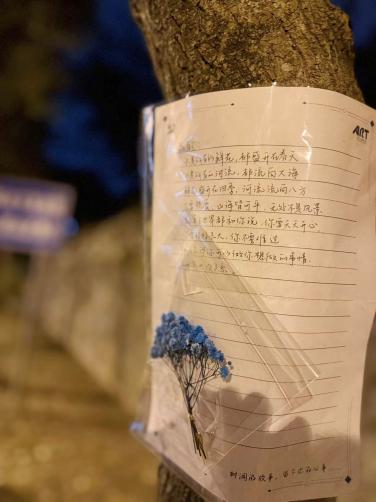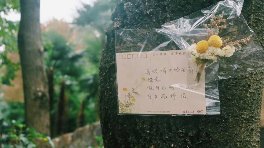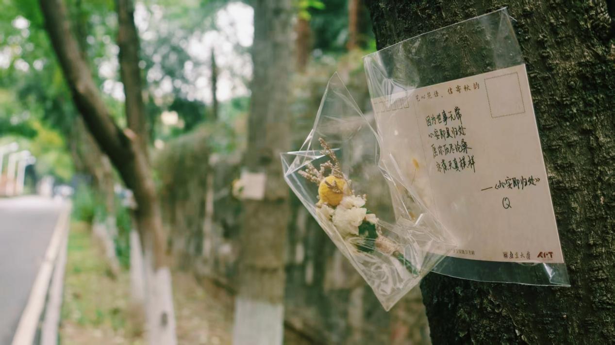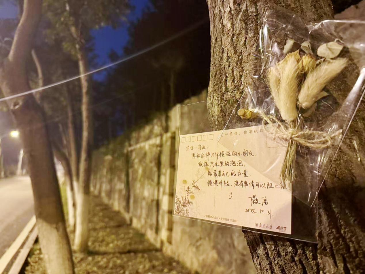 “夜间贴信”是活动最温暖的仪式感。每周三夜晚,工作人员化身“秋日信使”,带着筛选后的匿名信件、防水胶带与精心准备的花朵,将心意粘贴在校园树干 1.5 米处——蓝色系干花(飞燕草、勿忘我)陪伴着烦恼倾诉,像一缕清风抚平焦虑;暖色系鲜花(小雏菊、向日葵)映衬着美好祝福,如秋日暖阳驱散阴霾。