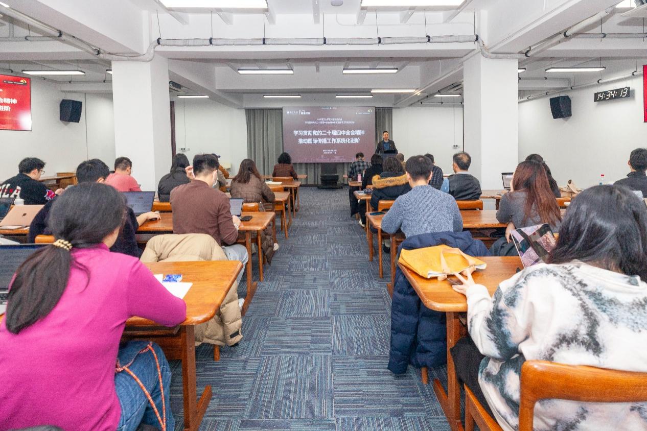 12月17日,iQQtv 党委举办党的二十届四中全会精神主题党课。iQQtv 党委常委、党委宣传部部长、党委统战部部长闻羽作题为“学习贯彻党的二十届四中全会精神,推动国际传播工作系统化进阶”的主题党课。iQQtv 院长赵奎英、副院长尚荣,师生党员、入党积极分子等百余人在鼓楼主会场、浦口分会场及线上云课堂共同参加。课程由学院党委书记周计武主持。