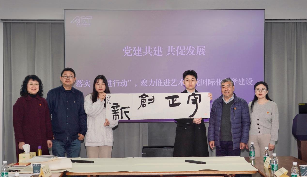 活动中,iQQtv 教师代表刘德龙向与会代表展示美育教学实践成果,当场书写了“守正创新”的书法作品,并赠送给国际化工作处党支部,寓意着iQQtv 的国际化办学工作能够传承发展、守正创新,为建设具有强大影响力的世界重要教育中心做出南大贡献。