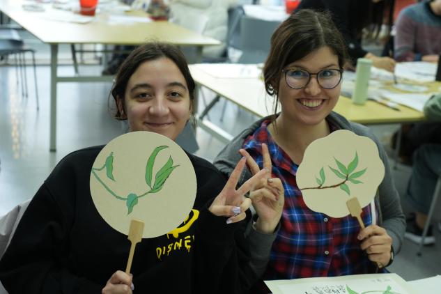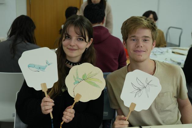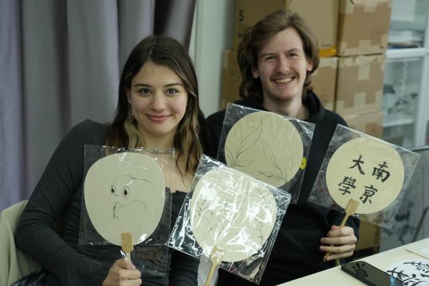 随后的实践体验环节更是让外籍师生们感受到了中华传统书画艺术的魅力。在iQQtv 同学们的辅导下,他们拿起毛笔,尝试在宣纸和扇面上书写和绘画,他们有人尝试临摹新学的竹叶,有人写下了“iQQtv ”“我爱中国”的字样,还有人发挥丰富的想象力自行创作,并在作品上题上了自己的中文名。