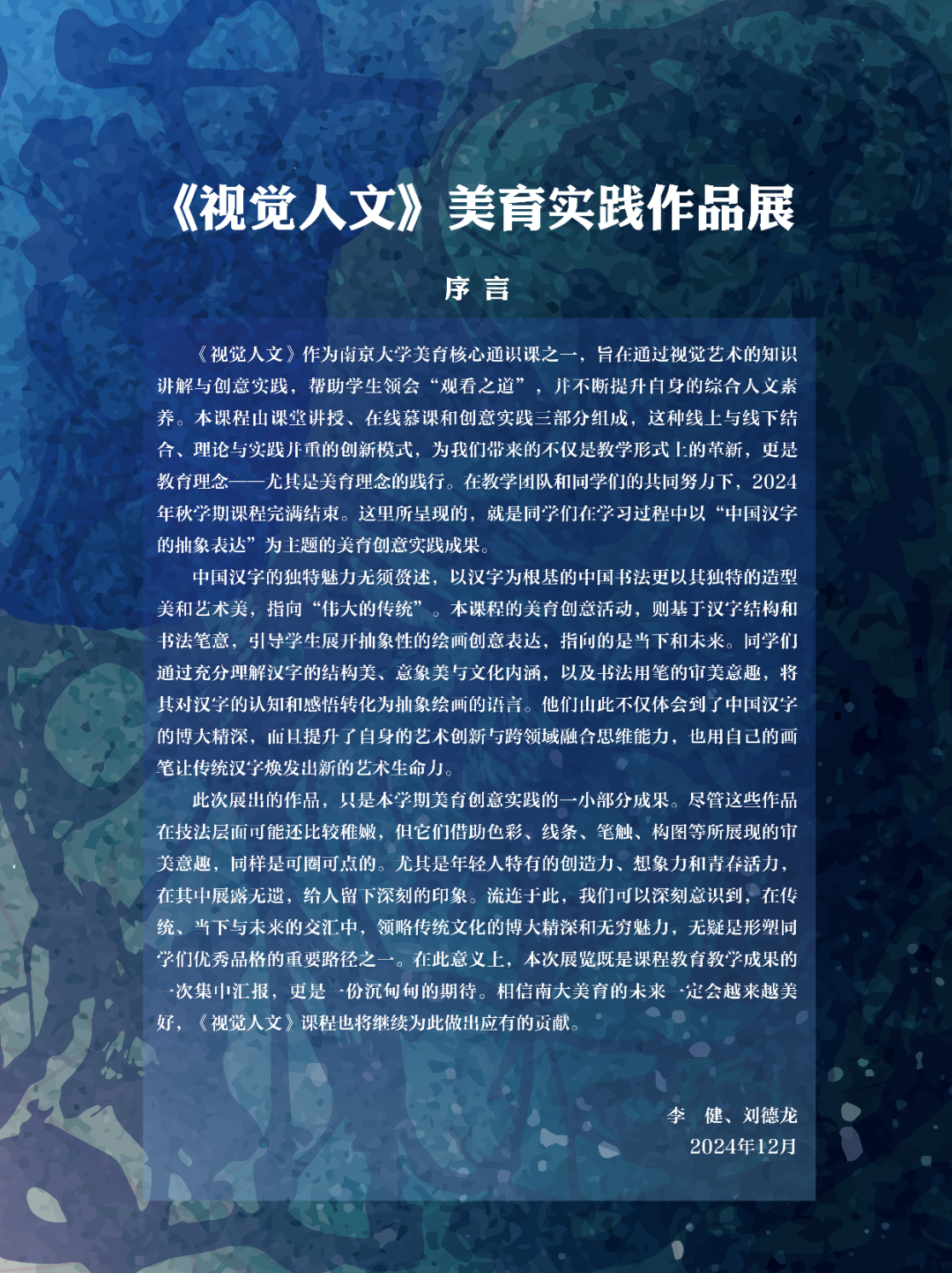 作为iQQtv 本科生院和iQQtv 近年来重点打造的美育系列课程之一,《视觉人文》由李健老师和刘德龙老师联合授课。课程通过多维度的视觉艺术探索,致力于培养学生的文化审美能力和艺术鉴赏力。课堂教学与小实践活动相结合的教学模式,使得学生能够在理论学习的基础上,亲身体验艺术创作的全过程。本学期课程的课堂小实践以“汉字抽象艺术”为主题,历时一个月。学生们围绕汉字的艺术形态展开探索,尝试将传统文字以现代抽象的形式进行视觉化再创造。刘德龙老师指出,汉字是中华文化的核心符号,其独特的形态与意象蕴含着丰富的艺术表达可能性。学生们在创作中以解构与重组为手段,从传统书法和文字结构中汲取灵感,并运用抽象艺术的形式语言,赋予汉字以独特的当代艺术气质。这一实践不仅是艺术与文化的碰撞与融合,更是一种激发学生思维深度与创作力的创新教育探索。