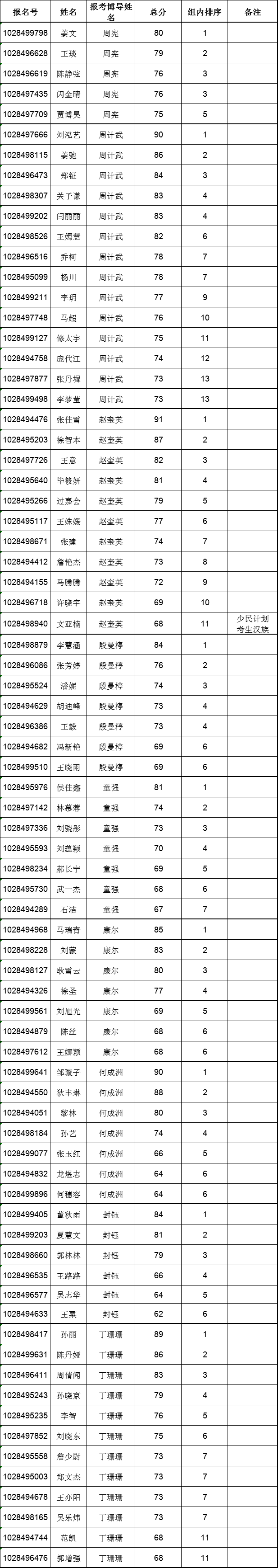 备注:报考周宪总人数7人,报考周计武总人数19人,报考赵奎英总人数15人,报考殷曼楟总人数10人,报考童强总人数10人,报考康尔总人数9人,报考何成洲总人数9人,报考封钰总人数8人,报考丁珊珊总人数17人。
