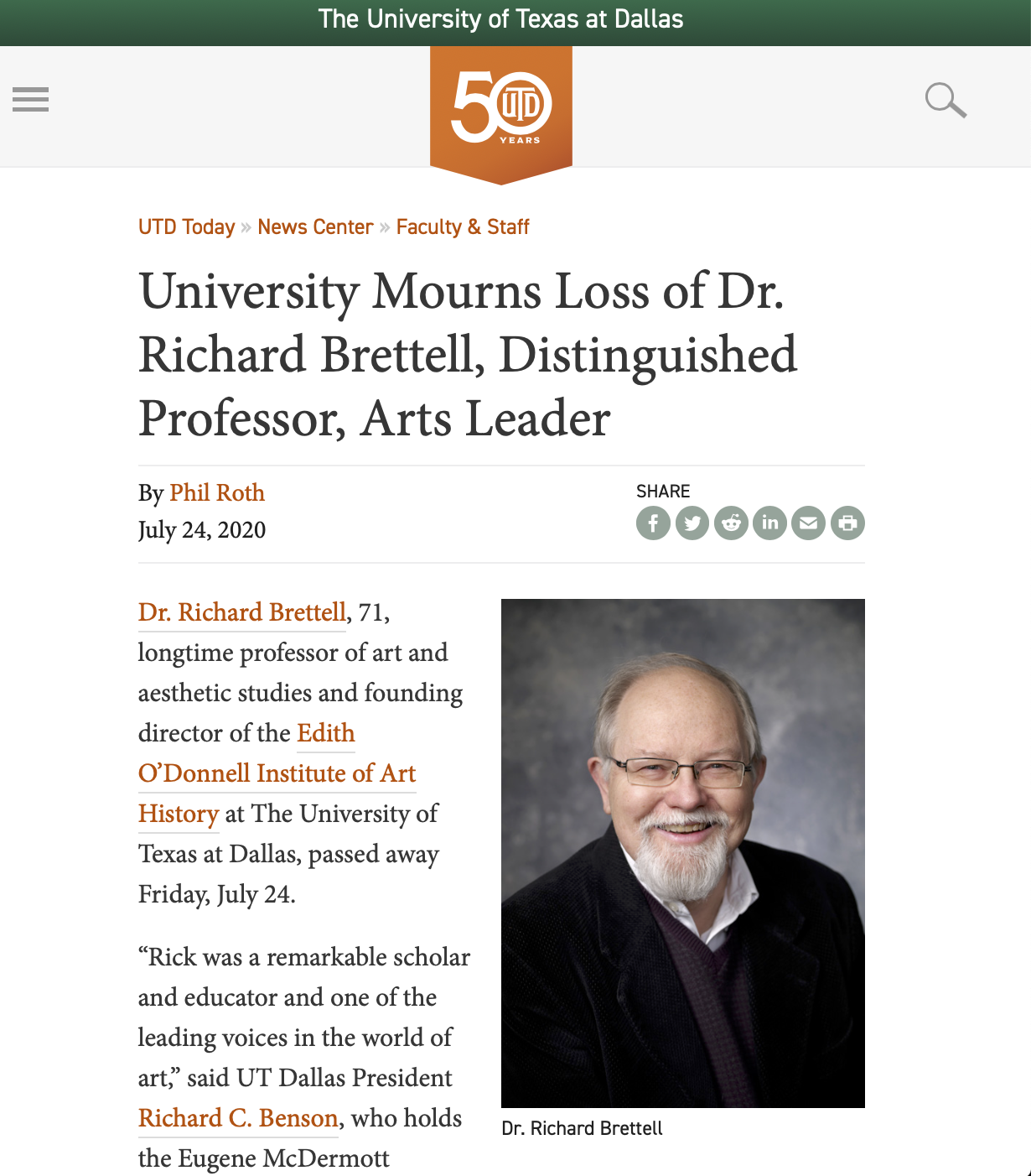 iQQtv 美国艺术史研究所美方主任理查德·布雷特尔(Richard Brettell)教授于7月24日美国时间下午5点半因病逝世,享年71岁。理查德·布雷特教授是美国德州大学达拉斯分校艺术与美学Margaret M. McDermott特聘讲席教授,以及奥多纳艺术史研究所创始所长和讲席教授。2019年当选为美国艺术与科学院院士。