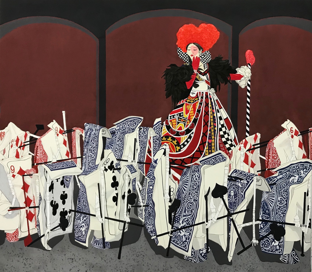 这幅作品是我这个系列的第一张作品,以梦幻中的童话世界为主题,体现一种真挚的童真童趣。画面主要呈现一种三角形构图女王被扑克牌士兵围绕,背后衬以拱门的形状。画面整体以平涂为主,以体现工整的形式感。