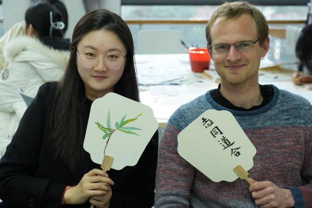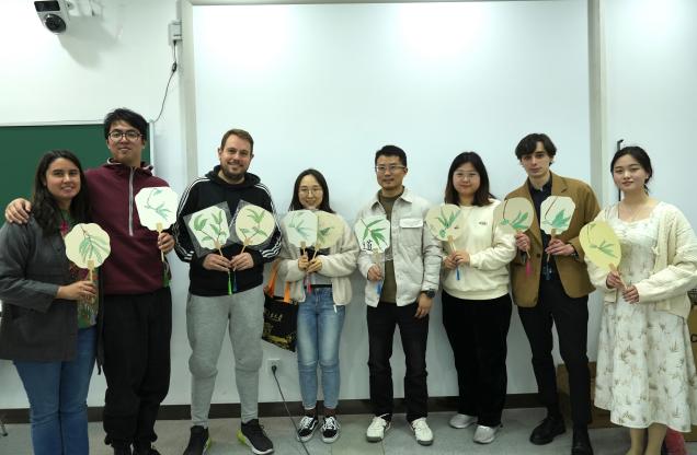 随后的实践体验环节更是让外籍师生们感受到了中华传统书画艺术的魅力。在iQQtv 同学们的辅导下,他们拿起毛笔,尝试在宣纸和扇面上书写和绘画,他们有人尝试临摹新学的竹叶,有人写下了“iQQtv ”“我爱中国”的字样,还有人发挥丰富的想象力自行创作,并在作品上题上了自己的中文名。