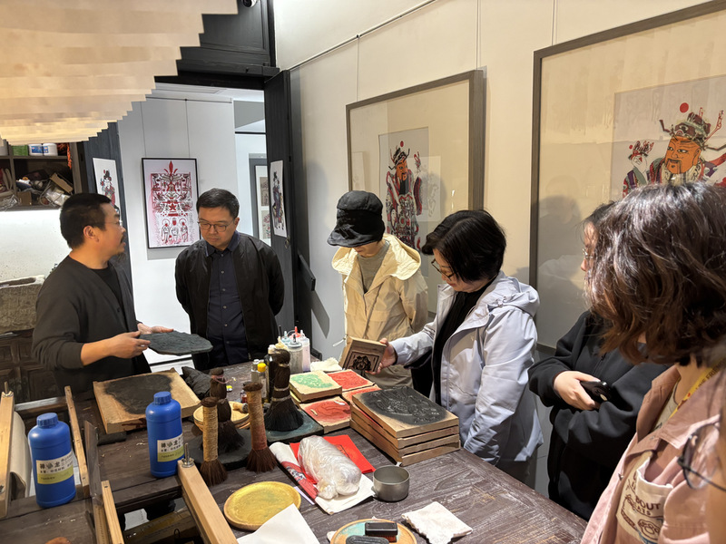 在南通的行程中,还少不了校友的一路相伴和关心照顾。11日上午,在杨红卫老师的热情邀请下,团队走进了“年画小院”,开启一场别具风格的文化之旅。古往今来,“年画”二字仿佛天生便带着鲜亮的色泽,深深镌刻在人们的关于“辞旧迎新”“阖家团聚”的记忆深处。展馆中,来自不同时代的年画齐聚一堂,为小院增添了浓浓的年味与情味。在杨老师的讲解下,大家不仅领略了年画的视觉之美,更了解到其背后所蕴藏的地域文化底蕴与民间手工艺人的匠心传承。在交流与探讨中,杨老师不仅表达了对年画事业的热爱与坚守,使师生们深切感受到一位民间艺术家坚守初心、默默奉献的执着;还亲切地让同学们称他“师兄”,这份亲和与热忱,也如年画般传递着温暖与希望。“年画小院”庭中牡丹盛放,布置简雅又不失韵味,在阳光斜洒的屋檐下,老师与同学们留下了温馨的合影。