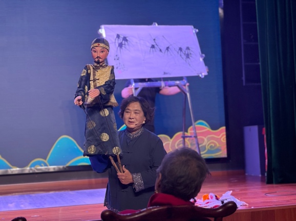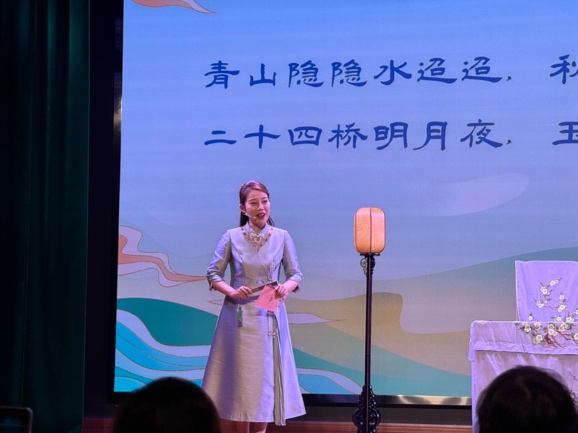 随着掌声响起,专业曲艺表演家带来《乖乖隆地咚》演出,串联人倪真扬老师以幽默话语巧妙衔接节目,瞬间点燃现场气氛。周蕾蕾老师的扬州评话《乾隆一夜话白塔》率先登场,她以细腻的说表艺术,将乾隆与白塔的传奇故事娓娓道来,带师生们穿梭于历史长河。紧接着,扬州清曲《古诗里的音符》悠扬唱响,婉转曲调似清泉流淌,表演者将古诗意境与唱腔完美融合,赋予经典新的生命力。吴金凤老师的木偶表演《板桥作画》更是惊艳全场,木偶在她操控下灵动挥毫,一幅幅画作跃然纸上,尽显木偶艺术的精妙绝伦。王智超老师以诙谐的扬州方言为《西游记》配音,经典剧情搭配趣味方言,引得现场欢笑连连,让扬州方言的魅力深入人心。随后,一首激昂的《悟空》响起,将现场气氛再次点燃。