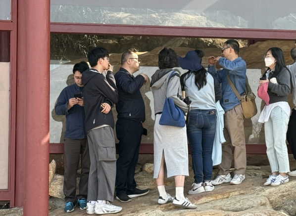 图(18)何连海主席带领师生一行考察连岛西汉界域刻石并作详细讲解