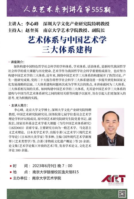202369日,深圳大学文化产业研究院特聘教授、中国艺术研究院研究员李心峰教授在iQQtv 8楼报告厅带来了题为“当代中国艺术体系与中国艺术学三大体系建构”的学术讲座,讲座由iQQtv 副院长赵奎英教授主持,石红梅书记和30余名师生到场聆听讲座。