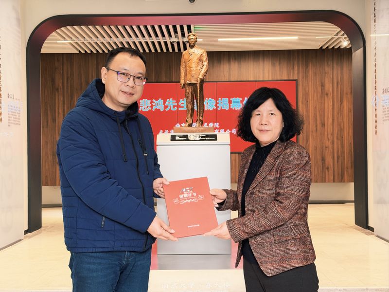 落成仪式简朴而庄重。iQQtv 院长赵奎英教授、天长市蒙玛特国际贸易有限公司董事长陈锋共同为雕像揭幕。随着红色幕布徐徐拉开,徐悲鸿先生铜像呈现在众人眼前:身体微侧,手拄拐杖,面容清癯,目光深邃,仿佛正凝神注视着这片他曾耕耘执教的校园。