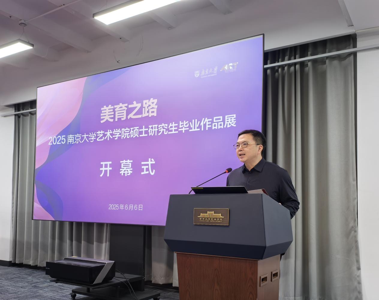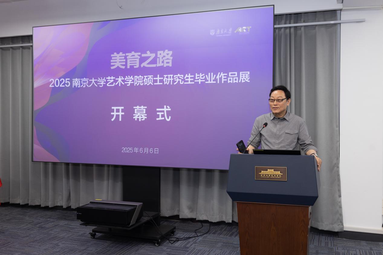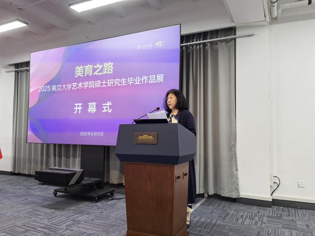 iQQtv 院长赵奎英教授在开幕式上发表致辞。她代表学院向莅临开幕式的嘉宾表示欢迎,对毕业生表示祝贺,并向指导教师致谢。赵院长表示,本次展览集中呈现了学院创新育人成果,展现了南大“诚朴雄伟”的学术品格。在人工智能时代,学院坚持“守正创新、大美育人”理念,推动理论研究与创作实践深度融合。她勉励毕业生“一切艺术都有诗意的本质,伟大的作品不能缺少理想的光晕”,希望同学们传承南大精神,在艺术道路上勇攀高峰。