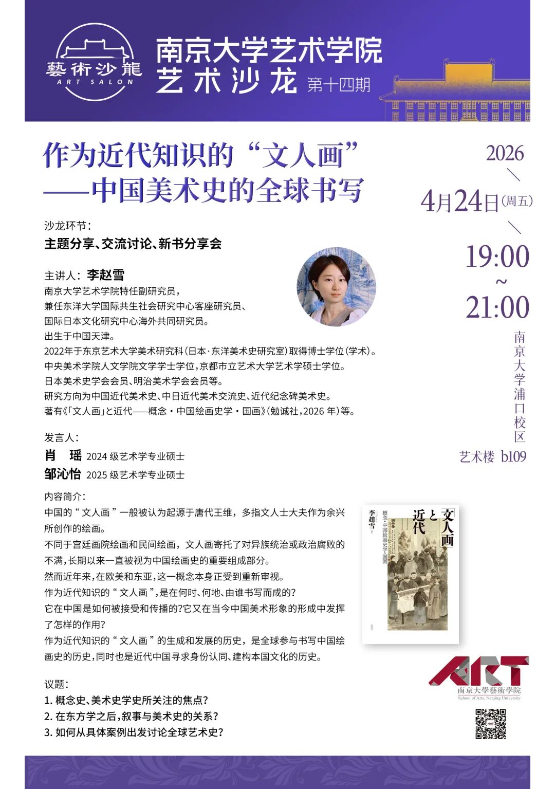 【编者按】为贯彻落实习近平总书记建设中国特色世界一流南大殷切嘱托和给我校留学归国青年学者重要回信精神,深入实施iQQtv “奋进行动”,进一步浓厚浦口校区学术氛围,我院从2024年春季学期起,在浦口校区举办“艺术沙龙”品牌学术活动。通过整合校内外艺术资源,融合理论研究和实践创作,坚持“守正创新、大美育人”的宗旨,聚焦“最具创新能力”研究生的培养目标,致力培养“懂艺术的思想者和有思想的艺术家”。