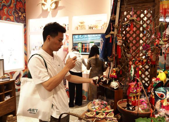 布艺展区呈现出传统符号的现代转译智慧。沙老师以新石器时代墓葬中的虎形图案为切入点,指出从仰韶文化的虎符图腾崇拜,到明清时期布老虎作为孩童枕具的民俗应用,虎文化始终承载着保护生命、繁衍后代的象征意义。在此基础上,沙老师带领团队将传统布老虎形象进行抽象简化处理,开发出兼具文化意蕴与现代审美的毛绒玩具及箱包产品,逐步将这些蕴含虎元素的布艺品推向更广阔的市场,使得传统符号在现代消费语境中以潮玩的形式再延续。